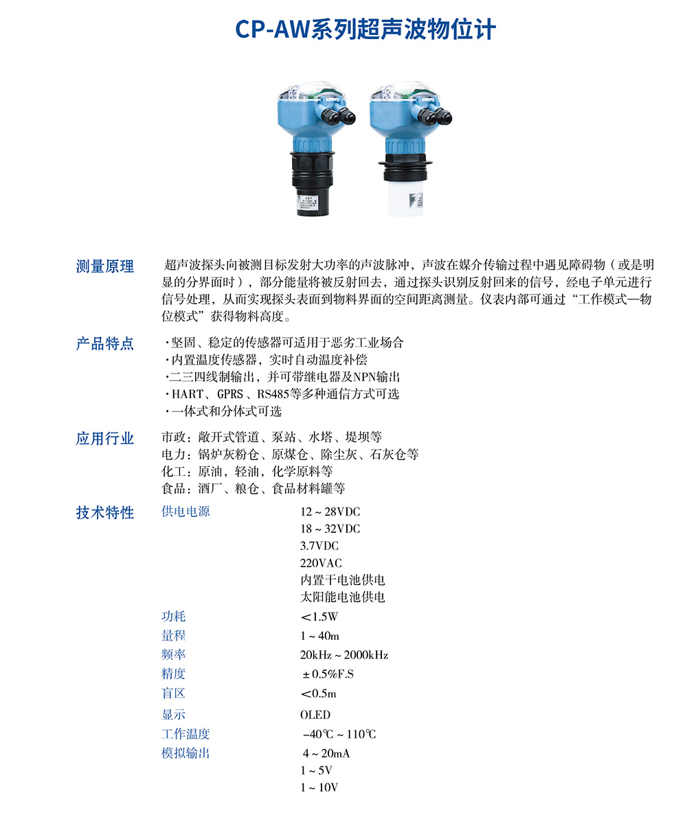 超聲波液位計是由微處理器控制的數(shù)字液位儀表。在測量中超聲波脈沖由傳感器(換能器)發(fā)出,聲波經(jīng)液體表面反射后被同一傳感器接收或超聲波接收器,通過壓電晶體或磁致伸縮器件轉(zhuǎn)換成電信號,并由聲波的發(fā)射和接收之間的時間來計算傳感器到被測液體表面的距離。 由于采用非接觸的測量,被測介質(zhì)幾乎不受限制,可廣泛用于各種液體和固體物料高度的測量。